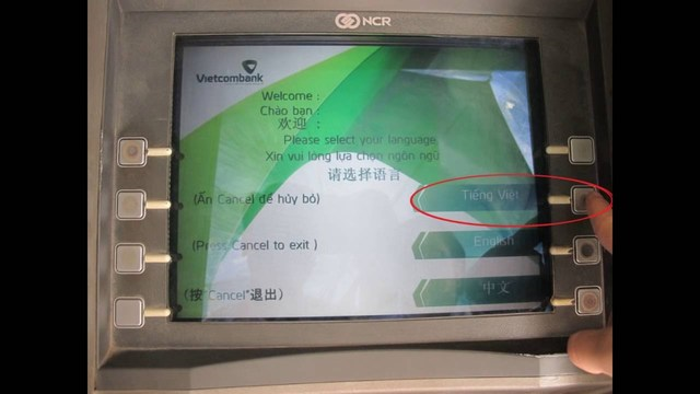 Trước khi cắm thẻ vào khe các bạn nên kiểm tra cẩn thận chắc chắn cho thẻ vào đúng hướng. Trên thẻ có dấu mũi tên nhỏ bạn chỉ cần đưa thẻ vào theo hướng mũi tên là được và lưu ý mặt có số thẻ nổi phải hướng lên trên. Khi đã cho thẻ vào trên máy sẽ xuất hiện dòng chữ “Please insert your card” và bạn chờ trong giây lát rồi giao dịch.