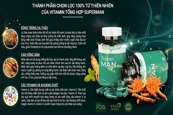 Về thành phần: vitamin tổng hợp Superman được chiết xuất từ các loại thảo dược quý hiếm có trong tự nhiên được chọn lọc kỹ càng theo tiêu chuẩn nghiêm ngặt nên đảm bảo mang đến sản phẩm chất lượng nhất đến tay người dùng.