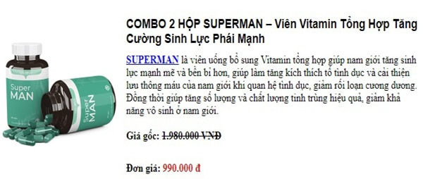 Vitamin tổng hợp Superman có giá bán theo combo 2 hộp là 990.000VNĐ/combo, bao gồm 60 viên dùng trong một tháng.